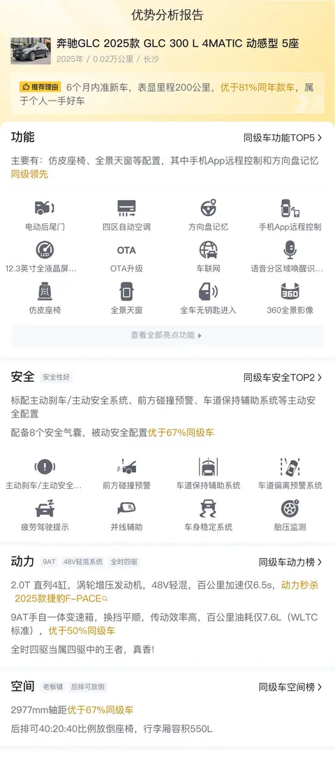 买二手车,配置要实用。这辆奔驰GLC 2025款 GLC 300 L 4MATIC 动感型 5座配有仿皮座椅、全景天窗等配置,其中手机App远程控制和方向盘记忆同级领先。安全配置上,标配主动刹车/主动安全系统、前方碰撞预警、疲劳驾驶提示等主动安全配置,配备7个安全气囊,被动安全配置优于75%同级车。其中的手机App 远程控制是个很实用的功能,可以通过手机去控制车辆的状态,比如忘记锁车了,可以直接用手机去操作,就很方便。