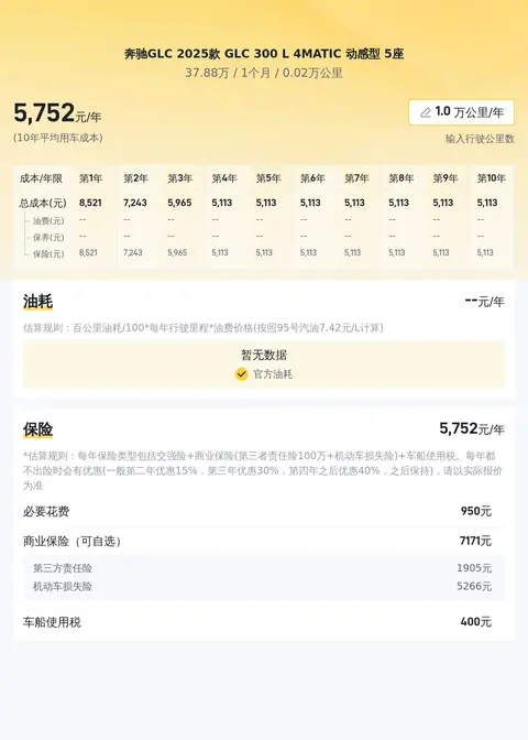 另外,同级车的最低10年平均用车成本是6794元/年,最高是17741元/年,而这辆二手奔驰GLC 2025款 GLC 300 L 4MATIC 动感型 5座是13838元/年,所以用车成本不算低。