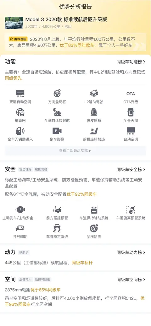 懂车帝平台数据显示,Model 3 2020款 标准续航后驱升级版的二手车报价在11.77-14.75万之间,这辆二手车的报价是11.8万,属于正常市场行情价格。平台数据显示这款车保值率较高,预计未来三年内折价较少。根据懂车帝平台数据,该车目前的热度比较高,暂居紧凑型车销量榜第2名,而且该车行驶里程较少,只有4.9万公里,未经过过户,属于一手车源,综合性价比指数高达72%,大数据显示该车价格合理,值得购买。
