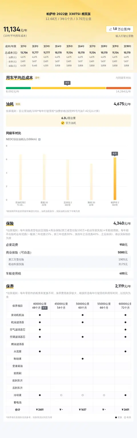 另外,同级车的最低10年平均用车成本是6141元/年,最高是14738元/年,帕萨特 2022款 330TSI 精英版是11333元/年,是适中的水准。