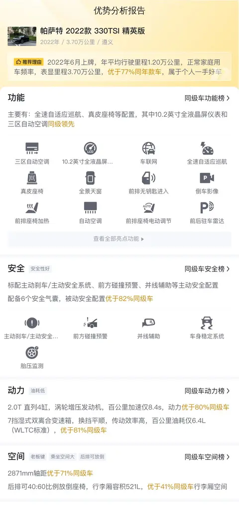 报价低于市场行情,因为帕萨特 2022款 330TSI 精英版的市场行情价是12.85万-15.79万,它的报价则是12.68万,所有价格上有优势,同时保值率也较高。