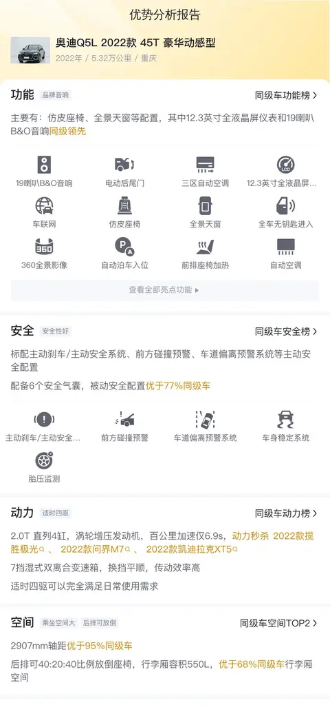 根据懂车帝的数据,这辆奥迪Q5L 2022款 45T 豪华动感型的二手车报价为23.18万元。在当前车况下(行驶5.32万公里,无重大事故、火烧、水泡),这个价格相对较高。奥迪Q5L 2022款 45T 豪华动感型的市场行情价为23.87万-28.31万,考虑到这辆车的车况良好,价格在合理范围内。根据懂车帝的大数据分析,奥迪Q5L 2022款 45T 豪华动感型的保值率为52.1%,在同级别车型中表现优秀。预计未来三年内,车辆的残值下降幅度不大,证明了其良好的市场认可度和保值能力。