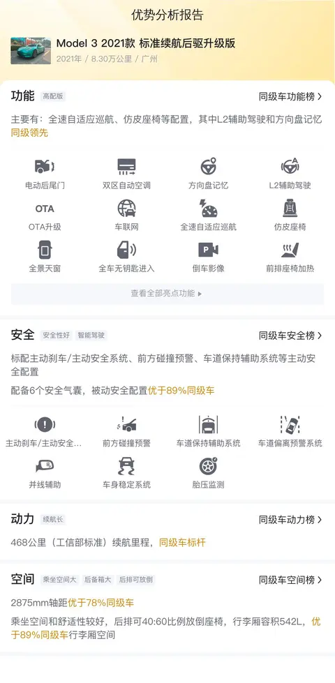 这台Model 3 2021款 标准续航后驱升级版配有全速自适应巡航、L2辅助驾驶、仿皮座椅、方向盘记忆、手机无线充电等配置。在安全方面,标配主动刹车/主动安全系统、前方碰撞预警、车道保持辅助系统等主动安全配置,配备6个安全气囊,被动安全配置优于90%同级车。其中的L2辅助驾驶是一个比较领先的配置,有了他,开车的时候不用时刻保持紧绷的状态,长时间开车也不会累。