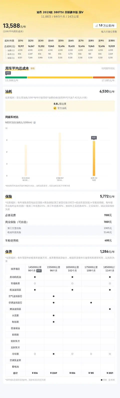 根据懂车帝平台的大数据计算,这辆途昂 2019款 380TSI 四驱豪华版 国V的10年平均用车成本大约为14181元/年,这一成本在同类车型中处于相对合理的范围内。需要注意的是,实际费用会根据车主的实际使用情况和所在地的消费水平有所变动。