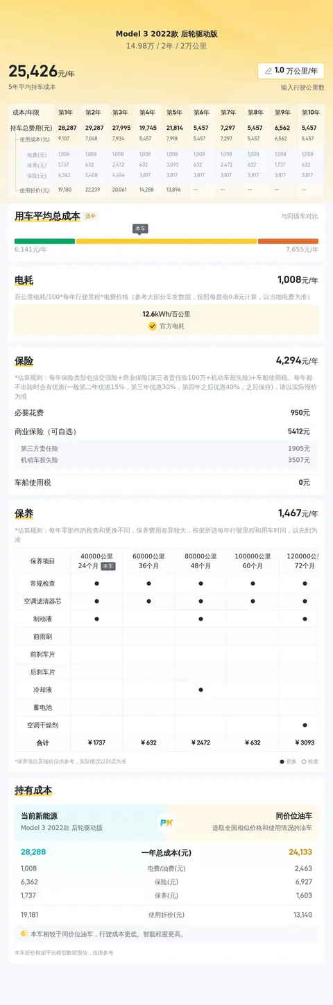 在车辆使用成本方面,这辆Model 3的表现同样出色。根据懂车帝的预估,未来5年的平均用车成本约为25137元/年,这对于一款性能卓越的电动汽车而言,无疑是一个相当合理的数字。更值得一提的是,由于电动汽车较低的能耗成本和维护成本,相比于同级别的燃油车,这辆Model 3能够为您节省更多。