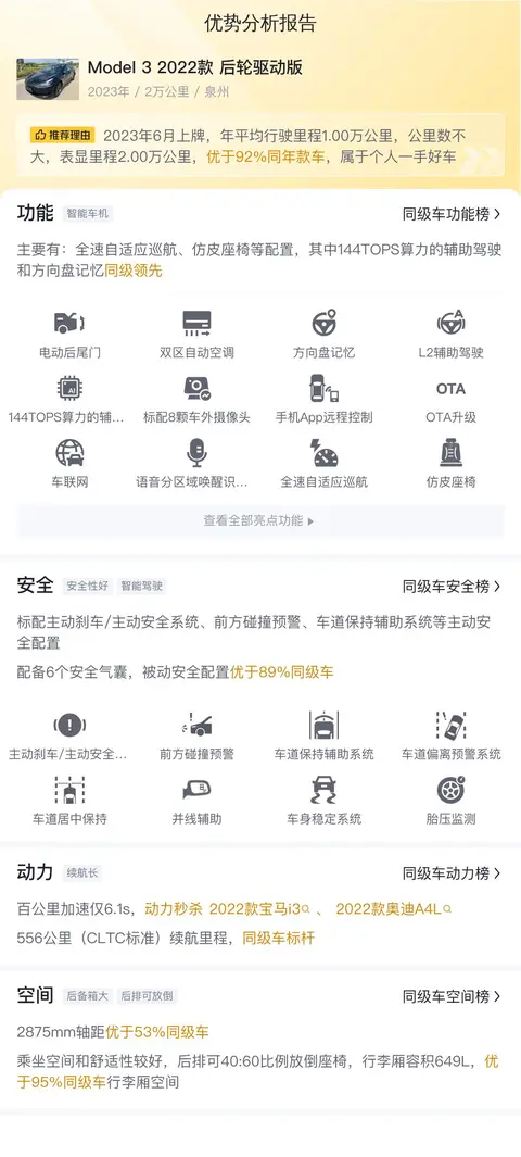 在配置方面,这辆Model 3同样表现出色。它采用了全速自适应巡航和L2辅助驾驶系统,使得驾驶更加轻松安全。此外,车辆还配备了仿皮座椅、方向盘记忆等功能,提升了驾乘的舒适性和便捷性。特别是其144TOPS的算力辅助驾驶和方向盘记忆功能,在同级别车型中处于领先地位。