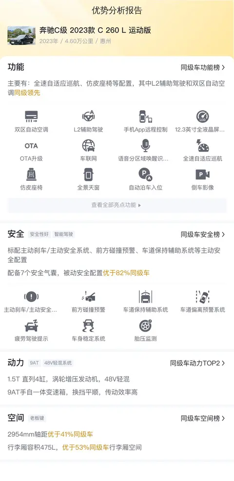 在市场行情部分,这辆奔驰C级 2023款 C 260 L 运动版的售价在21.9万至26.16万之间,具体售价要看车况而定。当前这辆车售价为21.98万,车况良好,性价比不错,对于想购买一辆豪华汽车又希望价格比较优惠的消费者来说,是很好的选择。由于新车售价动辄三四十万,所以这辆二手的奔驰C级 2023款 C 260 L 运动版在价格上是有很大优势的,而且车龄不大,正是性能最好的时候,而且只有一次过户,在二手车市场中算是很好的车源了。外观上独特的新绿色非常具有吸引力,内饰豪华,在动力、操控、安全和舒适性方面表现出色,无论是日常通勤还是长途旅行都能提供卓越的驾乘体验。虽然售价比新车便宜很多,但仍然属于豪华汽车范畴,普通人依然望尘莫及,如果您经济实力雄厚,这款车绝对是您的豪车首选。