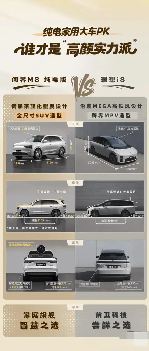 先来说说外观吧,从官图来看,问界M8纯电版的设计真的是未来感爆棚!流线型的车身线条,搭配超大尺寸的前脸格栅,整体气场非常强大。尤其是LED大灯组,点亮后辨识度极高,妥妥的“路上最靓的仔”。车身侧面和尾部的设计也非常协调,运动感与豪华感兼具,感觉这车开出去绝对能吸引一波回头率!不知道大家对这个设计怎么看,反正我是已经被种草了!