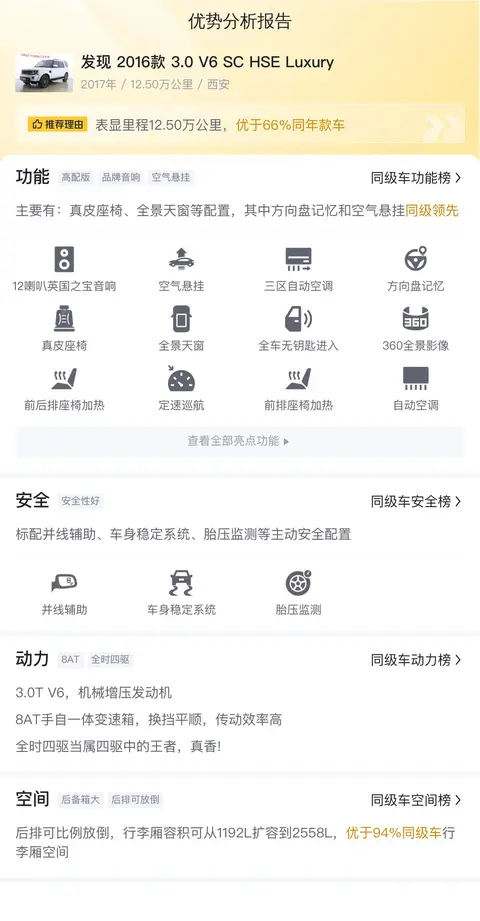 这辆发现 2016款 3.0 V6 SC HSE Luxury,定位是中大型SUV,车身外观颜色是白色,内饰是深色配色。累计行驶里程是12.50万公里,该车符合国IV排放标准。