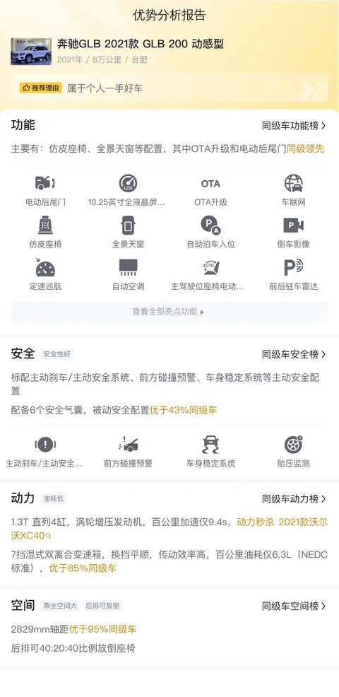 咱们买车,肯定要参考市场行情,这辆GLB的售价14.8万,符合市场价,且未来两年的降价幅度也不会超过5%,购车可放心。从保值的角度来看,这辆车在二手车市场还是比较受欢迎的。在用车成本部分,这辆车的官方百公里油耗是6.3升,按每年行驶一万公里里程计算,油费大约5273元,年度商业保险约5168元,每年保养费用约3668元,平均年度用车总成本约14109元。以上只是参考值,实际用车成本受行驶里程和用车环境等因素影响。