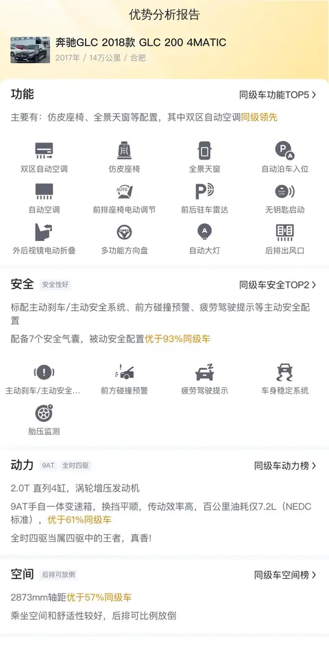 这辆奔驰GLC 2018款 GLC 200 4MATIC在动力性能、操控性能、舒适性和配置方面都有着出色的表现。搭载一台2.0T涡轮增压发动机,最大功率为184马力,峰值扭矩达到300牛·米,提供了充沛的动力输出,同时配备了9挡手自一体变速箱,不仅换挡平顺,还保证了良好的燃油经济性。车内空间较为宽敞,前后排乘客均可享受到较为舒适的乘坐体验。行李舱容积也能够满足日常出行的行李存放需求。座椅采用仿皮材质,质感与舒适性表现都不错。配备了电动座椅调节功能,驾驶者和乘客可以根据自己的喜好调整座椅的角度和高度,找到最舒适的坐姿。车内装有全景天窗,不仅增加了车内的采光,还能让乘客在旅途中欣赏到美丽的风景。其他的配置,如自动空调、定速巡航等,也都一应俱全,为驾驶者和乘客提供了更加舒适和便捷的驾乘体验。