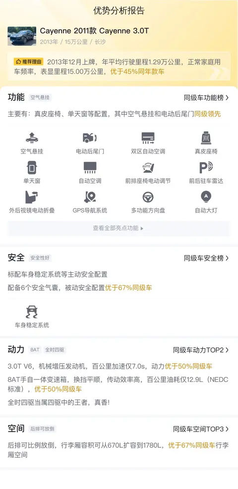 据估算,同级车的最低用车成本是17178元/年,最高是40280元/年,Cayenne 2011款 Cayenne 3.0T是25354元/年,用车成本适中。