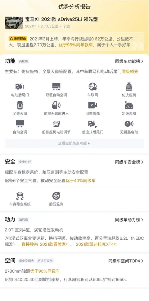 今天我们要看的这辆宝马X1 2021款 sDrive25Li 领先型,上牌地、车源地均在浙江宁波,上牌时间为2021年3月,表显里程2.7万公里,白色车身深色内饰,新车指导价30.98万,二手车报价12.88万,过户次数0次,可做3成首付分期购车。支持信用卡分期、贷款、置换等购车方式,提车时还可享线下优惠价格。