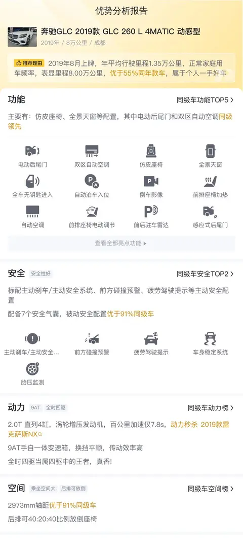 据估算,同级车的最低用车成本是13980元/年,最高是18792元/年,奔驰GLC 2019款 GLC 260 L 4MATIC 动感型是15708元/年,整体适中。