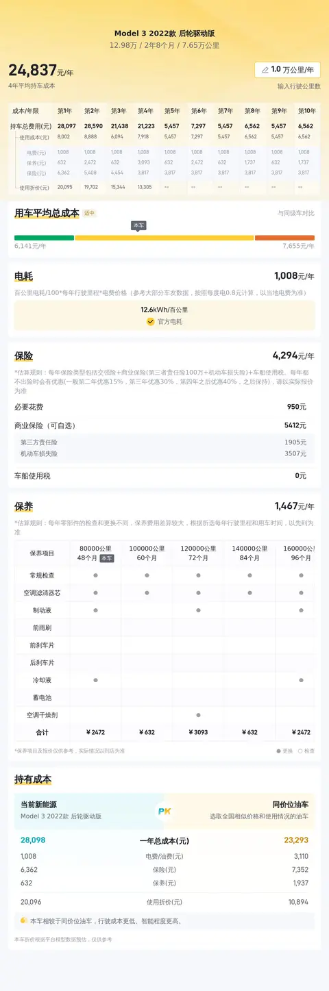 根据懂车帝的大数据分析,这辆二手Model 3 2022款 后轮驱动版的10年平均用车成本大约在每年2.5万元左右。其中包括油费、保险费、保养费等各项开支。当然,具体费用还会根据车主的驾驶习惯、用车频率等因素有所变动。与同级别车型相比,Model 3作为一款电动汽车,其燃油经济性更高,保养成本也相对较低,因此在长期使用过程中,您可以节省一笔不小的费用。对于预算有限或希望减少用车成本的消费者来说,这辆二手Model 3无疑是一个值得考虑的选择。