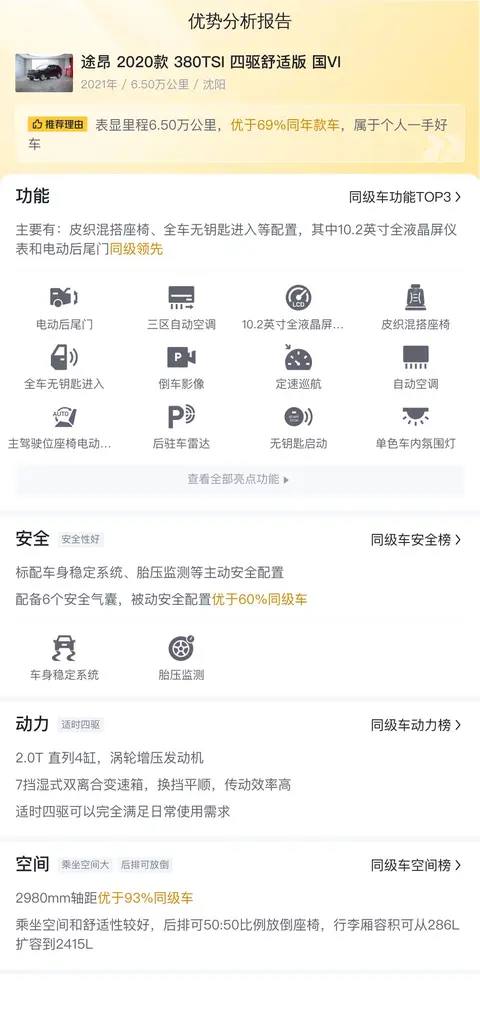 综上所述的新车含税价、用车成本、市场行情、优势分析、同款比价等数据仅供参考。在配置部分,因为二手车非标品,车辆可能会存在配置改装的情况,具体车况信息需要线下结合车辆实际情况进行综合参考。