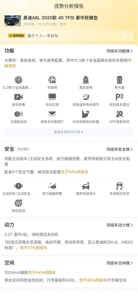 综上所述,这辆二手奥迪A6L 2020款 40 TFSI豪华致雅型以其合理的价格、良好的车况、丰富的配置以及优异的性能表现,展现出了极高的性价比。它不仅适合商务人士作为工作用车,同时也适合作为家庭第二辆车使用。如果你正在寻找一辆价格实惠、品质可靠的中大型轿车,那么这辆奥迪A6L无疑是一个值得考虑的选择。