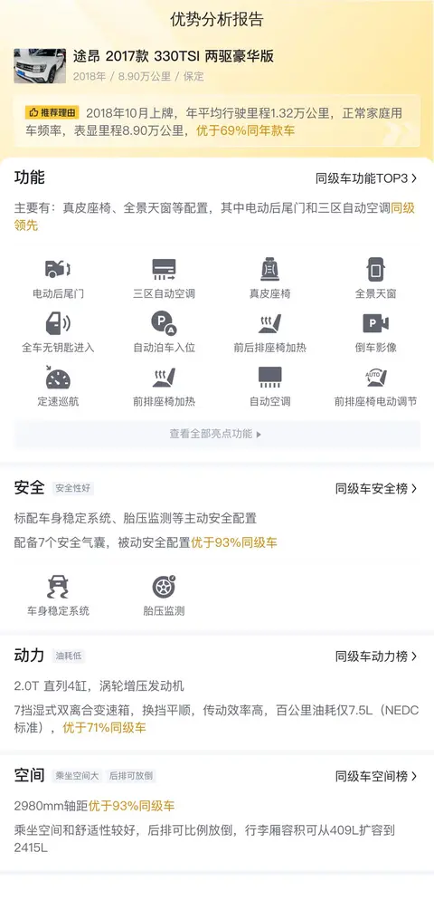 综上所述的新车含税价、用车成本、市场行情、优势分析、同款比价等数据仅供参考。在配置部分,因为二手车非标品,车辆可能会存在配置改装的情况,具体车况信息需要线下结合车辆实际情况进行综合参考。