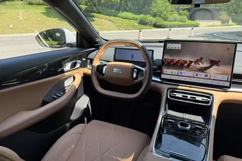 中控台上面是 15.4 英寸 2.5K 高清中控屏,分辨率有 2560*1600px,显示得很清晰。用手指在屏幕上滑动几下,120Hz 的刷新率让画面很流畅,和平时用的平板手感差不多。旁边是 8.8 英寸的液晶仪表,前面还有 16.6 英寸的 W-HUD,亮度有 12000nit,就算在太阳底下,导航信息、红绿灯读秒这些内容也能看得很清楚,开车的时候不用老低头看仪表盘,能更专心。座椅带有 14 点指压按摩功能,有 8 种按摩模式可以选。试了一下,浮点顶起高度能到 95mm,力度不算太大,但能明显感觉到按摩的效果。跑长途的时候开着这个功能,应该能缓解不少疲劳,在这个价位的车型里能有这样的配置,确实挺少见。。
