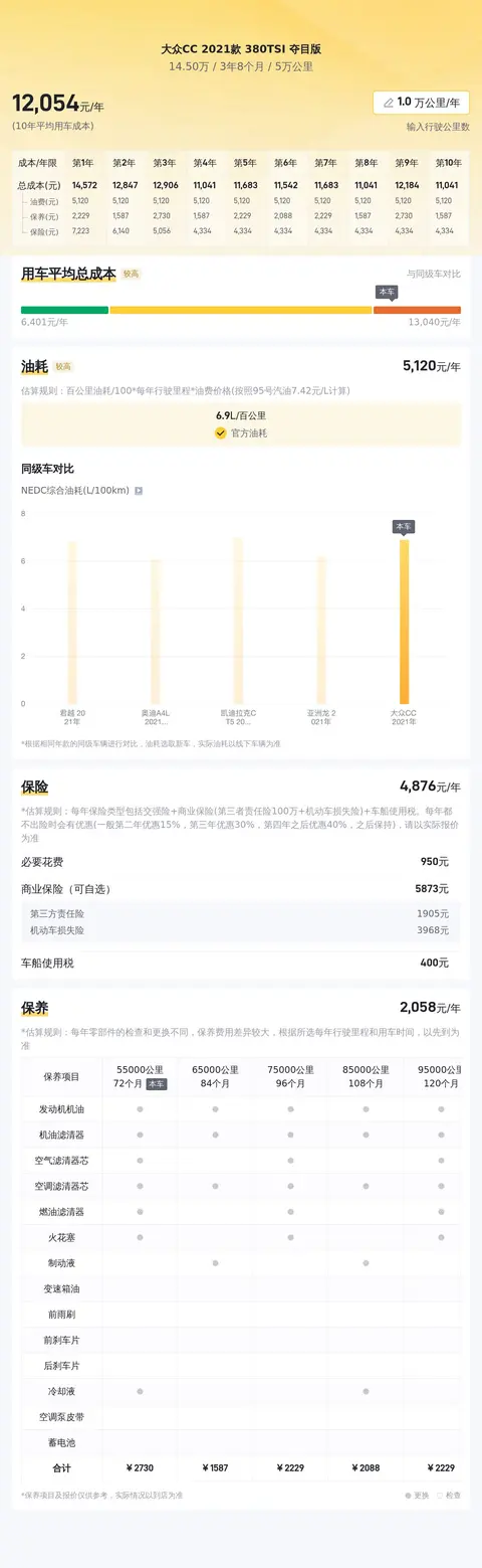 这款车的百公里油耗为6.9升,按照每年行驶2万公里计算,每年的油费约为5600元。此外,保险费用每年约为5000元,保养费用每年约为2000元。这些费用因人而异,但总体来说,这款车的使用成本还是比较合理的。