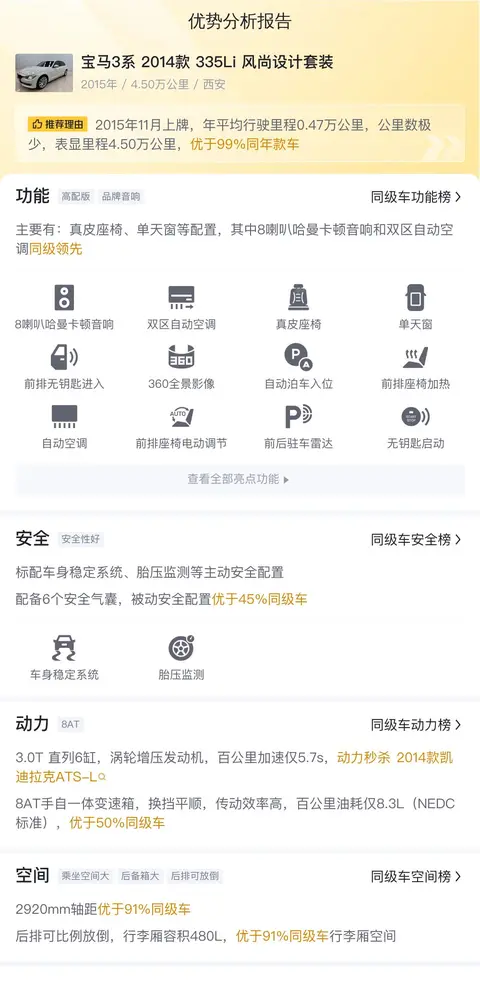 该车属于宝马3系 2014款 335Li 风尚设计套装,防爆胎,带哈曼卡顿音响,为国IV排放标准。车源地与车牌地均为西安,上牌时间为2015年11月,表显里程4.5万公里,有两次过户记录,车身颜色为白色。