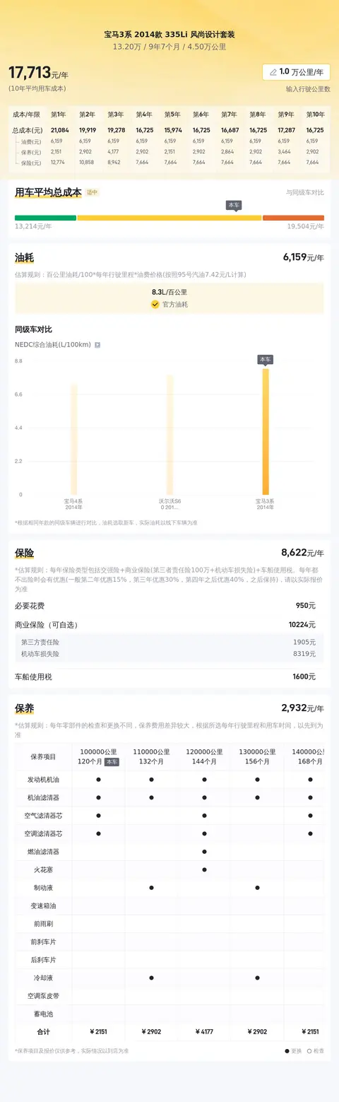 这款车的百公里油耗为8.3L,按照一年行驶2万公里计算,每年的油费大约为14407元。该车的百公里油耗在同类车型中处于较高水平,这可能是由于多种因素导致的,包括发动机排量大(3.0T)、马力足(306Ps)以及车身重量较重(整备质量1760kg)等。对于追求极致性能体验的驾驶者来说,他们可能愿意为了获得更高的动力输出和更优秀的加速性能而接受相对较高的油耗。然而,如果驾驶者更注重燃油经济性和日常使用成本,则可能需要权衡油耗与性能之间的关系,并根据个人需求和预算做出合适的选择。在不考虑其他费用大幅波动的情况下,根据估算,该辆车的年均综合用车成本约为18104元。