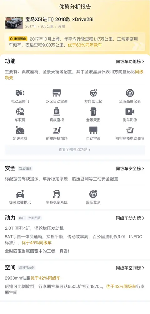 据估算,同级车的最低用车成本是14988元/年,最高是22724元/年,而宝马X5(进口) 2018款 xDrive28i是17683元/年,所以用车成本适中。
