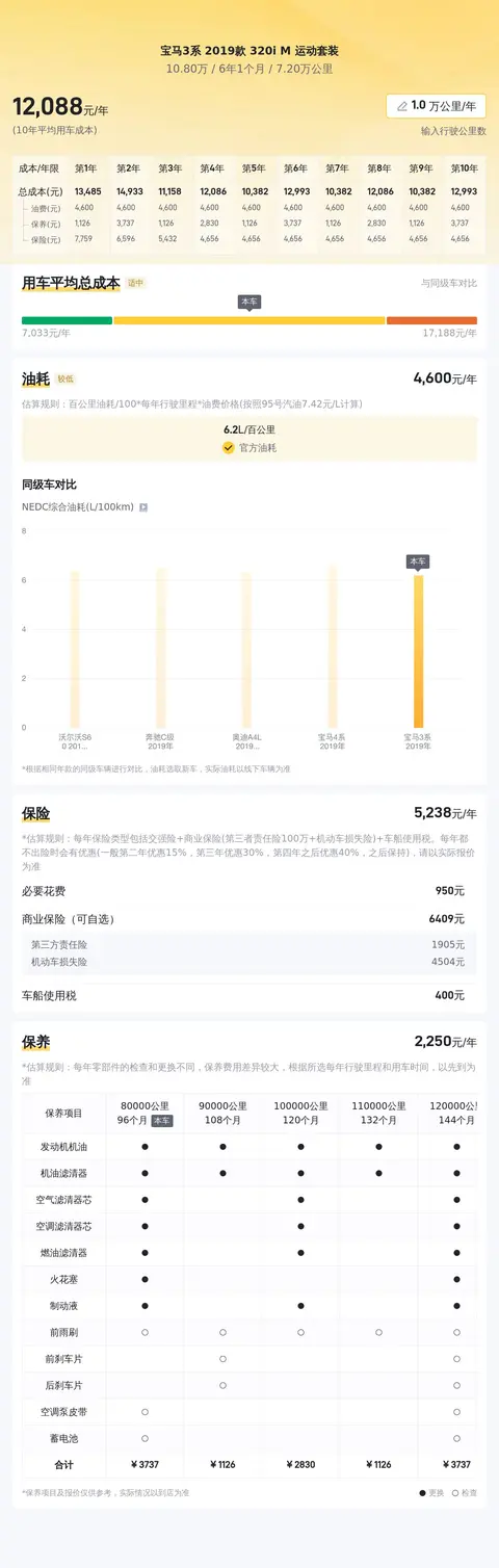 当前市场上,这款宝马3系2019款320i M运动套装的二手车价格大致在14.03万至17.15万之间。当然,具体的售价会受到车辆状况等多种因素的影响。至于用车成本方面,根据一些车主的反馈和估算数据,这辆宝马3系2019款320i M运动套装的平均每年用车成本大约在1.2万元左右。这包括了油费、保险费、保养费以及其他可能产生的费用。不过,具体的用车成本还是会因个人的驾驶习惯、用车频率以及地区差异等因素而有所不同。
