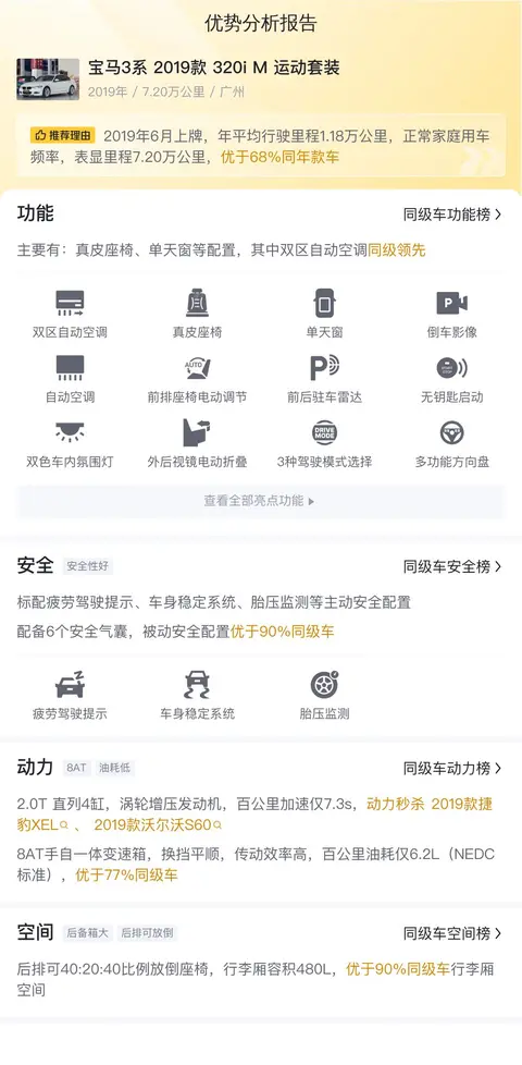 这辆二手宝马3系2019款320i M运动套装来自广州,上牌日期2019年6月,上牌时间刚好6年,过户1次。新车含税价为33.86万,目前二手车报价10.8万,开6年多便宜了23.06万。里程方面,它的表显里程为7.2万公里,车源地与上牌地均为广州。此车符合国六排放标准,从环保和能源效率的角度来看,它展现了一种对未来负责的态度,选择这样的车,也就是选择了一种更绿色、更可持续的出行方式。
