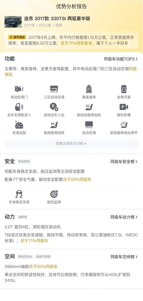 综上所述,这辆途昂 2017款 330TSI 两驱豪华版在动力、安全、舒适性和空间等方面都展现出了出色的表现,是一款值得家庭用户考虑的中大型SUV。需要注意的是,该车目前未提供第三方检测报告,具体的车况还需要消费者实地检验。祝您购车愉快!