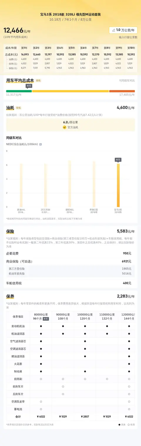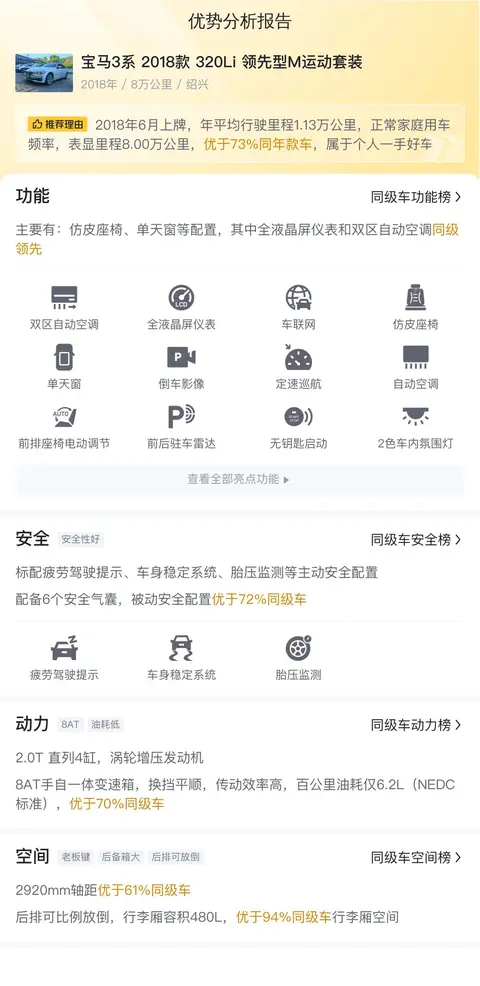 320Li 领先型 M运动套装隶属于宝马3系(图片|配置|询价),而宝马3系则是宝马集团旗下的核心产品之一,以其卓越的操控性能和精致的设计赢得了全球消费者的广泛赞誉。宝马3系的历史可以追溯到1975年,当时的第一代车型就以其出色的驾驶性能和均衡的设计成为了市场的焦点。随后,每一代宝马3系都在继承前代优点的基础上不断演进,以满足消费者日益增长的驾驶需求和审美期待。而文中介绍的这款宝马3系 2018款 320Li 领先型M运动套装搭载2.0T发动机,匹配8挡手自一体变速箱,车源地和上牌地均为绍兴,该车首次上牌时间为2018年6月,过户次数为0次,个人一手车,目前行驶里程为8万公里,新车指导价为34.98万,而现在的二手车报价为10.18万。