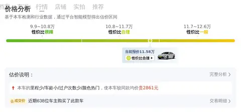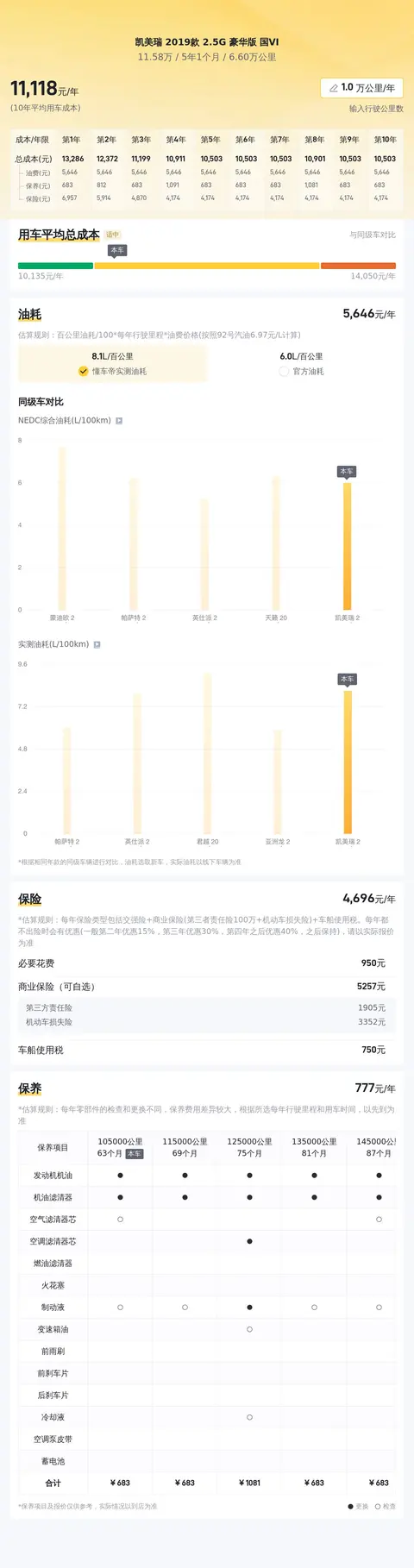 价格部分,当前市场上与这辆凯美瑞相类似的车型,售价基本都在10-13万之间,具体售价要看车辆的实际情况。而在用车成本部分,根据估算,这辆车的年均综合用车成本约1.1万元左右,实际费用开销根据车主的使用情况而有所不同。