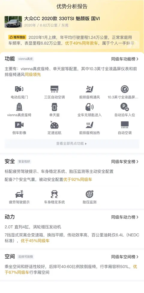 优势:颜值高,被称之为没有缺点的艺术品,有着“最美大众车”的称号,外观设计绝对的颜值爆表,动感时尚,还有无框车门,运动感十足,受到了很多年轻人的追捧和热爱。空间大,毕竟是中型车,乘坐舒适,动力也不错,整体的性能还是不错的。价格更不用说啦,现在只要10.38万,如此准新的车况,价格却如此的实惠,不可多得。