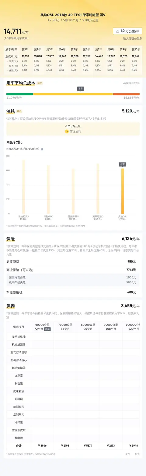 根据估算,奥迪Q5L 2018款 40 TFSI 荣享时尚型 国V的10年平均用车成本约为15180元/年,而同级车的最低10年平均用车成本约为11260元/年,最高是21780元/年,所以本车的用车成本适中。