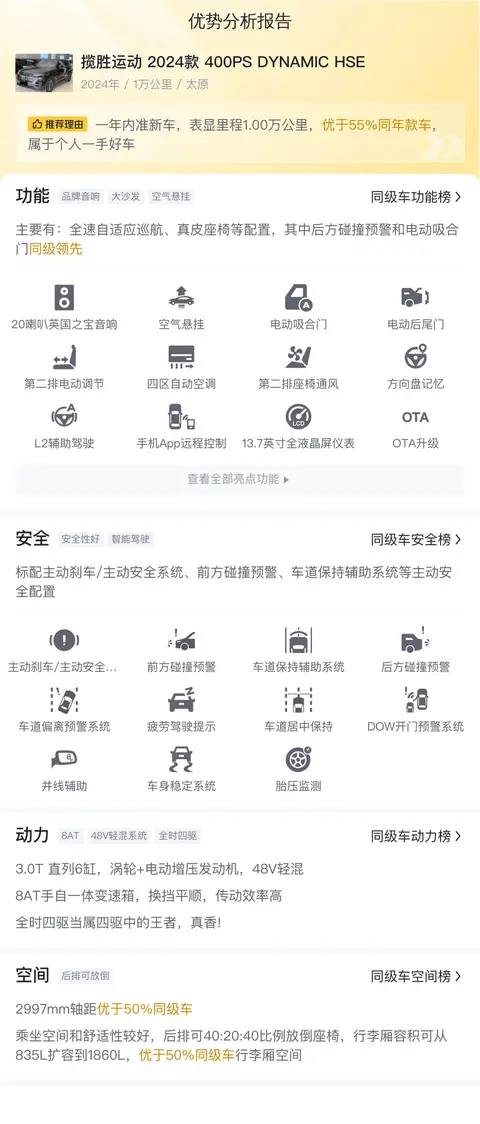 综上所述,揽胜运动 2024款 400PS DYNAMIC HSE在配置、动力、空间等方面均表现出色,尤其在科技配置和安全配置上更是领先于同级别车型。无论是日常城市驾驶还是长途旅行,它都能为驾驶者和乘客提供舒适、安全且愉悦的驾乘体验。
