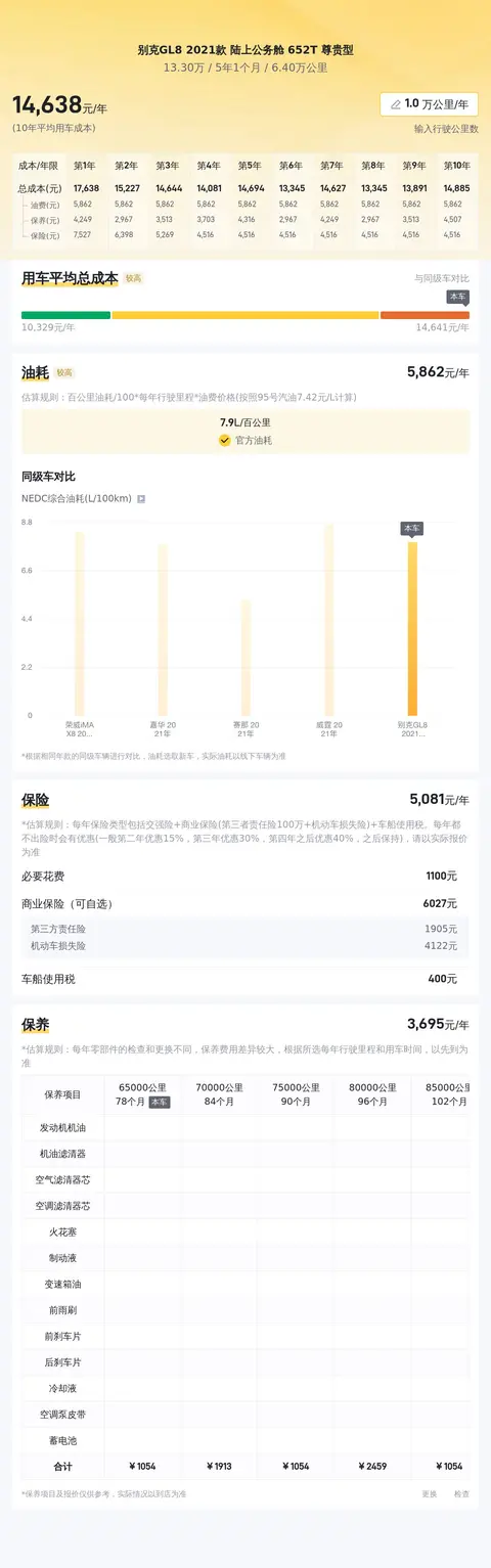 据估算,别克GL8 2021款 陆上公务舱 652T 尊贵型的用车成本也低,因为同级车的最低用车成本是14468元/年,最高是17708元/年,别克GL8 2021款 陆上公务舱 652T 尊贵型是15178元/年,所以较低。