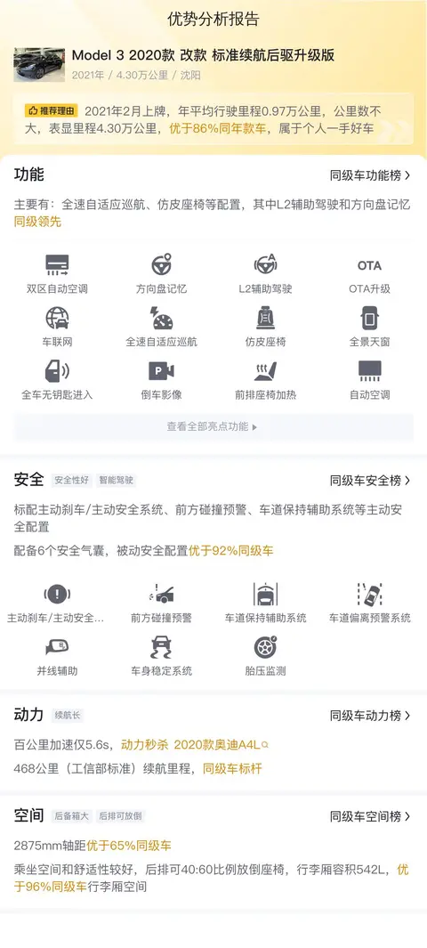 一年半的车,有哪些实用的配置呢?Model 3 2020款 改款 标准续航后驱升级版的亮点配置在于全速自适应巡航、分段式不可开启全景天窗、L2辅助驾驶、双区自动空调等。