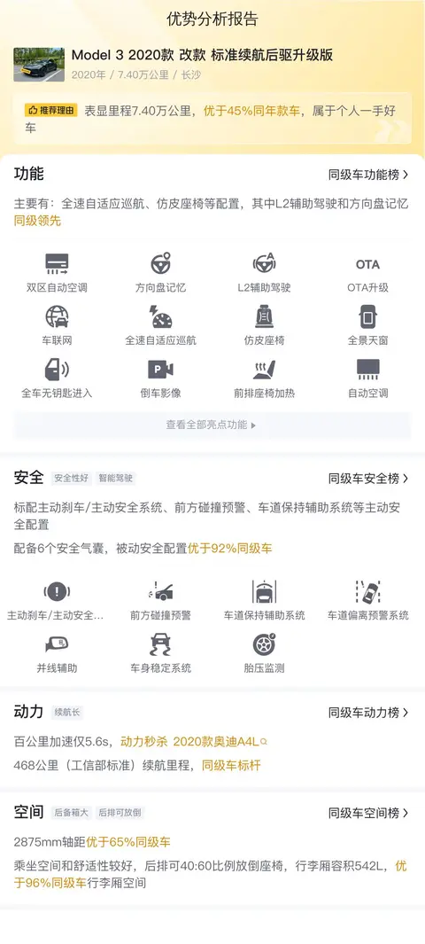 综上所述,这辆二手Model 3 2020款 改款 标准续航后驱升级版凭借其合理的售价、节能的用电成本、舒适的乘坐体验以及充足的储物空间,成为了二手车市场中的一款颇具吸引力的电动轿车。尽管已经行驶了7.4万公里,但其车况良好,未经过过户,显示出其稳定的性能和可靠的品质。这款车不仅能满足日常通勤的需求,还能提供一定的驾驶乐趣,无论是城市驾驶还是长途旅行,都能为驾驶者带来满意的体验。需要注意的是,由于这辆车尚未进行第三方权威机构的全面检测,因此潜在买家在决定购买之前,建议自行或聘请专业人士进行全面的检查和评估,以确保车辆的实际情况符合个人期望和需求。总的来说,这辆Model 3是一款性价比较高、值得考虑的二手车选择,但购车决策应基于充分的了解和评估之上。