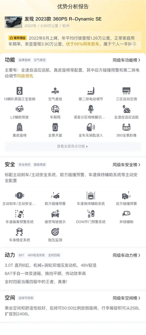 综上所述的新车含税价、用车成本、市场行情、优势分析、同款比价等数据仅供参考。在配置部分,因为二手车非标品,车辆可能会存在配置改装的情况,具体车况信息需要线下结合车辆实际情况进行综合参考。