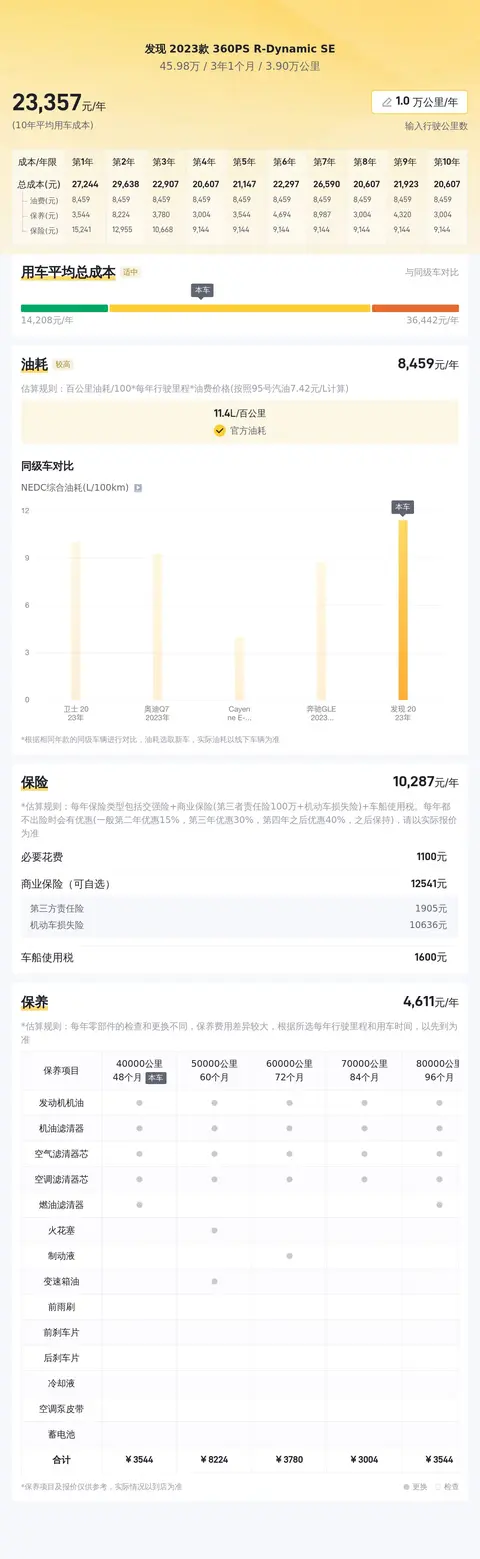 在用车成本方面,根据估算,这辆车的年均综合用车成本约为2.3万元。当然,实际费用支出会因人而异,受多种因素影响。