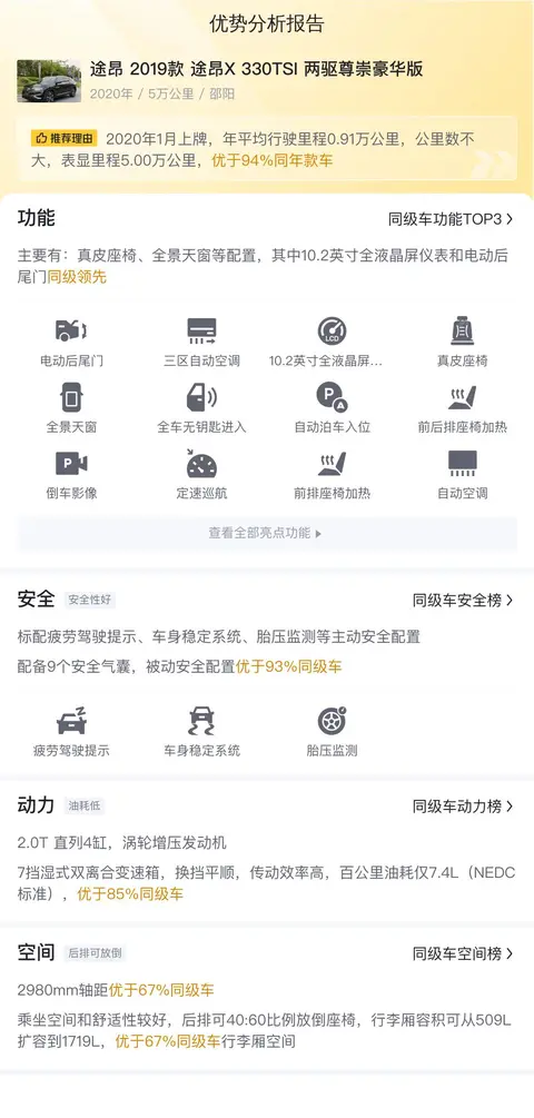 途昂 2019款 途昂X 330TSI 两驱尊崇豪华版这款车怎么样?综合懂车帝大数据分析,这款车在同级别车型中表现非常出色。无论是在动力性能、内饰配置还是智能互联方面,它都展现出了较强的竞争优势。而且,这款车的售价相对较低,对于想要购买一款高品质中大型SUV的消费者来说,无疑是一个非常不错的选择。当然具体还要结合车辆实际情况进行综合参考,欢迎交流。