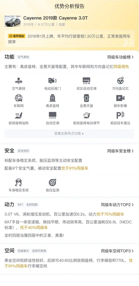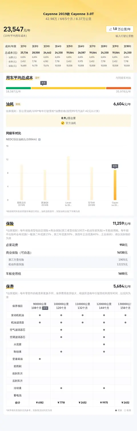 据估算,同级车的最低用车成本是17045元/年,最高是24771元/年,Cayenne 2019款 Cayenne 3.0T是23798元/年,所以用车成本不算低。