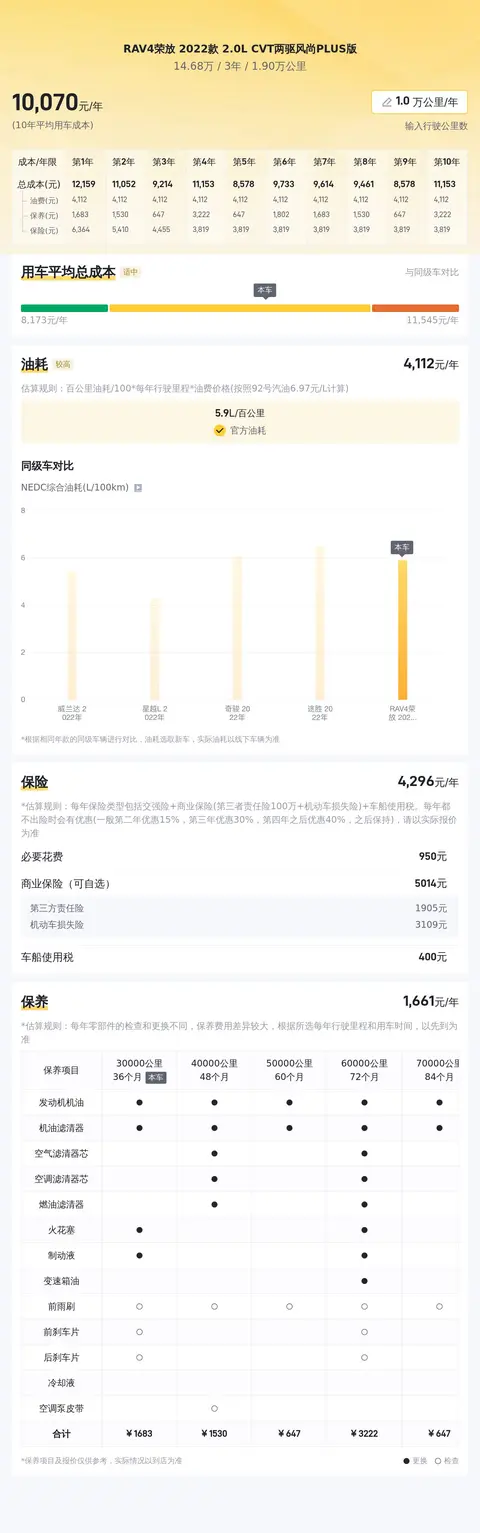 如上图所示,这辆车的10年平均用车成本约为10,151元/年,这对于一个能全家出行的SUV来说,费用并不是很高。