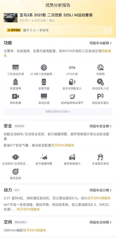 综上所述,这款宝马3系 2021款 改款 325Li M运动套装是一款集豪华、运动、科技于一身的轿车。它在外观设计、动力性能、内饰配置以及市场行情等方面均表现出色,是一款值得消费者考虑的二手车选择。如果您正在寻找一款性能卓越、品质可靠的二手车,那么这款宝马3系无疑是一个不错的选择。目前该车正在火热销售中,欢迎随时前来咨询和选购,我们将竭诚为您服务!