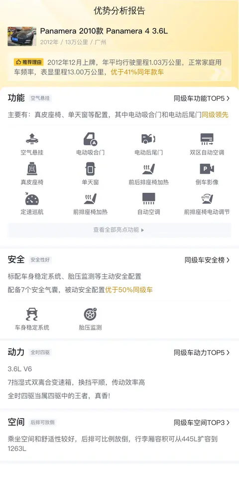 优势:保时捷的牌子摆在这,又有谁会不喜欢?看到这辆Panamera 2010款 Panamera 4 3.6L的外形,就有种想要据为己有的冲动。最重要的是,它虽然是12年的老车,但里程数不大,性能方面依旧强悍,而且售价合理,很值得入手。