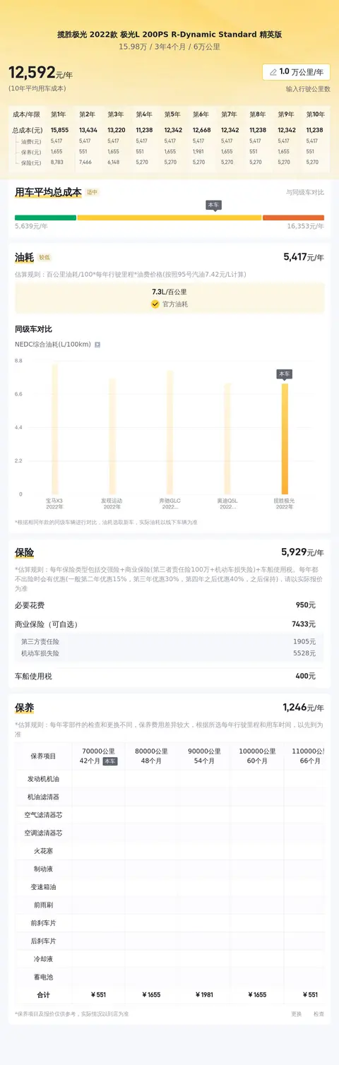 在考虑购买二手车时,除了初始购车成本外,还需要合理预期日常使用过程中的各项开支。对于2022款揽胜极光L 200PS R-Dynamic Standard精英版这款车型而言,其年均综合用车成本大约为每年1. 3万元左右。这一估算基于多个因素,包括油费、保养费、保险费以及可能出现的维修费用等。值得注意的是,实际用车成本可能会因个人驾驶习惯、车辆维护状况和地区差异等因素而略有不同。因此,在评估用车成本时,建议潜在买家根据自身情况进行适当调整和预期。年均1.3万元的用车成本相对较为合理,但买家仍需确保这一支出符合自己的经济能力和长期规划。