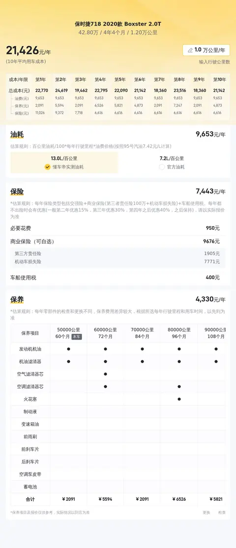 接下来,我们来聊聊大家比较关心的用车成本问题。根据估算,这辆718 Boxster的年均综合用车成本约为2.1万元左右。当然,这个花销还是要根据车辆的实际使用情况而有所不同滴!接下来,我们将为您展示该车未来三年内,按每年行驶一万公里计算的用车成本预算,希望可以助您一臂之力,助您做出更加清晰的用车成本规划哦~
