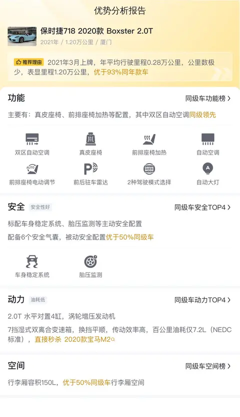 今天要为您介绍的这款2020款保时捷718 Boxster 2.0T,上牌地、车源地均为风景秀丽的海滨城市——厦门,上牌时间为2021年3月,过户次数为1次。这辆车的表显里程为1.2万公里,符合国六排放标准,车身颜色为白色。新车指导价为56.5万元,而现在的二手车报价为42.8万元。