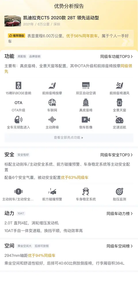 综上所述,凯迪拉克CT5 2020款 28T 领先运动型是一款动力性能出色、配置丰富、空间宽敞的豪华中级轿车。虽然内饰材质和隔音效果有待提升,但整体来说仍是一款值得推荐的车型。对于那些追求驾驶乐趣和舒适性的消费者来说,CT5是一个不错的选择。该车目前售价为12.98万,对于那些想要购买一款豪华中级轿车但预算有限的消费者来说,也不失为一种好的选择。