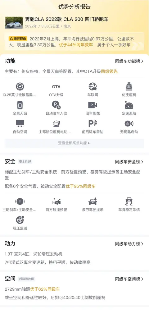 奔驰CLA自2013年首次亮相以来,以其独特的四门Coupe设计和合理的价格,迅速吸引了全球市场的眼球。它的成功并非偶然,而是奔驰品牌长期以来对创新的追求、对年轻市场的精准把握以及对产品品质的严格要求的集中体现。今天我们就为您带来一辆二手奔驰CLA 2022款 CLA 200 四门轿跑车,作为奔驰CLA系列的重要一员,它完美地继承了这一车系的核心竞争力,并在此基础上不断进化,以适应更加年轻化、个性化的市场需求。这辆奔驰CLA 2022款 CLA 200 四门轿跑车,上牌地车源地均为南京,上牌日期2022年2月,表显里程3.3万公里,白色车身深色内饰,新车指导价29.98万,二手车报价15.8万,过户次数0次。